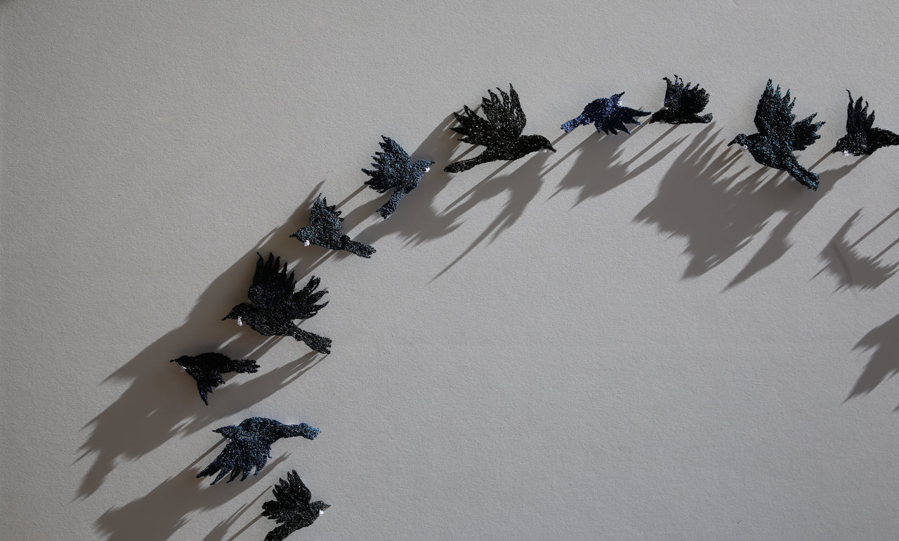 This Tůĩ thread sculpture was inspired by the iconic bird of our country. A very boisterous native to New Zealand, with its dazzling blue, green, bronze plumage and distinctive white throat tuft, and gorgeous song. I am fortunate to have plenty of these birds around my garden.