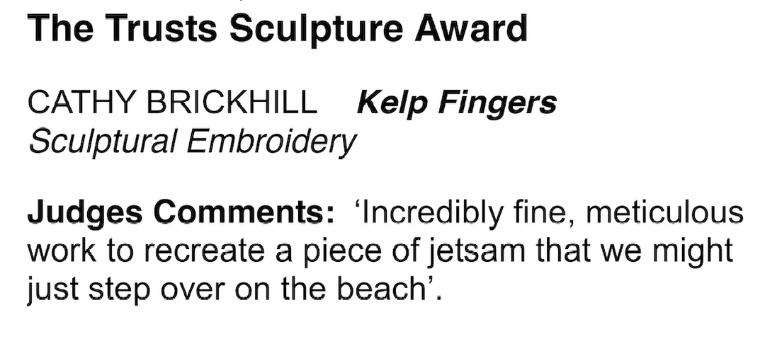 On my first time entering the Auckland Art Awards and Exhibition I was ecstatic to win the 3rd prize placing for my 'Kelp Fingers' sculptural embroidery in the sculpture category and won first place in the peoples choice award. This piece later was sold to a private collector.