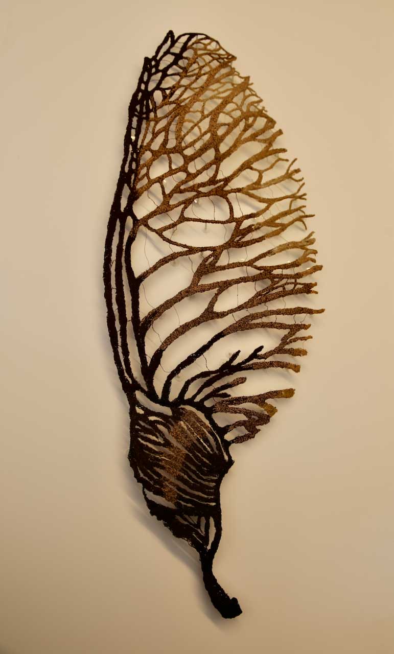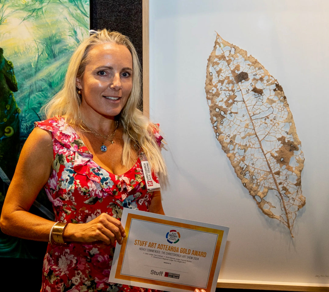 I was thrilled to receive an award for placing 2nd at the Christchurch art show in the Stuff art Aotearoa Gold awards 2024. This was my sculpture named 'Large Mahoe Leaf Skeleton.'